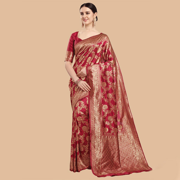 Maroon and gold-toned banarasi saree. Ethnic motifs woven design saree with woven design border Has zari detail. The saree comes with an unstitched blouse piece. The blouse worn by the model might be for modelling purpose only. Check the image of the blouse piece to understand how the actual blouse piece looks like.