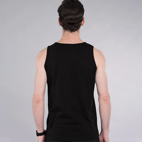 Black printed innerwear vest, has a round neck, sleeveless