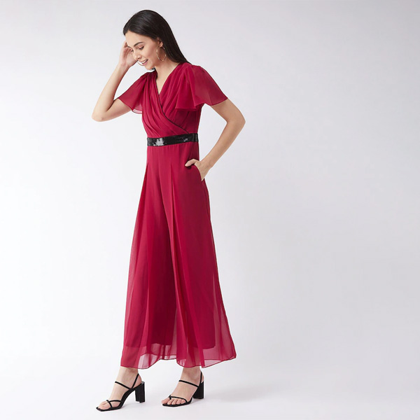 Pink & Black Pleated Jumpsuit with Embellished Waist